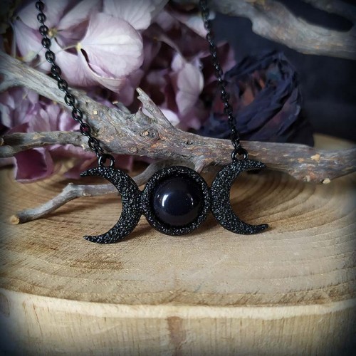 23,00 €Collier pendentif triple lune wiccan noire, avec cabochon diamètre 10 mm en goldstone. Pendentif en alliage de zinc 44 x 18 mm.