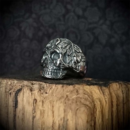 Bague tête de mort en acier, décor motif végétal, couleur argent vieilli.