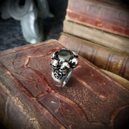 Bague pierre facettée noire (12 mm de diamètre), sertie en 6 points, et supportée par 6 crânes lui servant de base. Bague en acier couleur argent vieilli. Modèle homme et femme.
