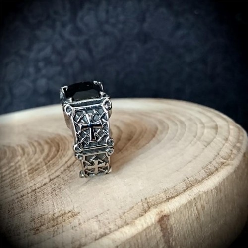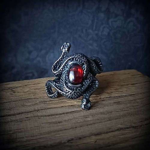 Bague serpents entrelacés, enveloppant une pierre rouge sertie au centre. Bague en acier couleur argent vieilli relativement massive. Modèle homme et femme. Motif 27 x 32 mm.
