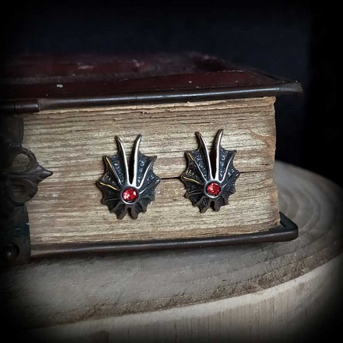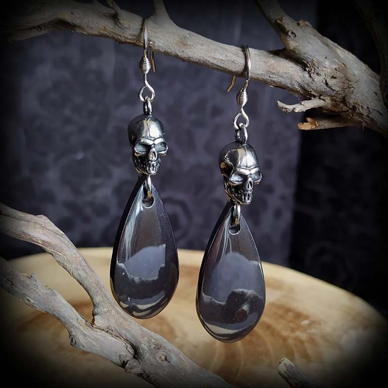 Boucles d'oreilles goutte hématite, tête de mort acier