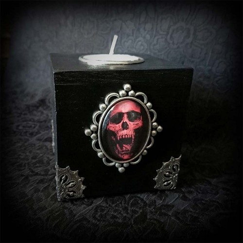 Bougeoir gothique cube en bois noir, cabochon argenté tête de mort rouge