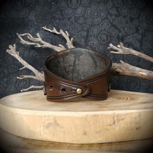 Bracelet en cuir marron de conception artisanale, création originale de l'Atelier de Maître Hobbit, entièrement fait main. Cuir pleine fleur, tannage végétal, teinture pigments naturels, cire artisanale. Le bracelet est gravé d'un motif viking, la rune symbole de la musique, gravée à la main. Belle finition, qualité artisanale, durée de vie assurée. Fermeture cartouchière (3 niveaux). Largeur de la face 5,5 cm.