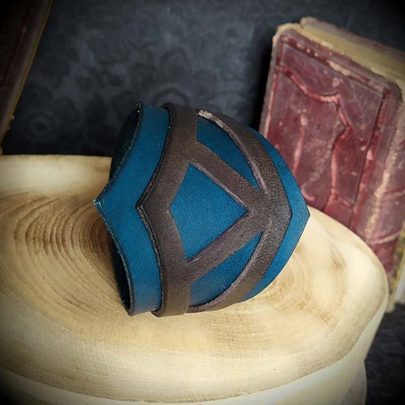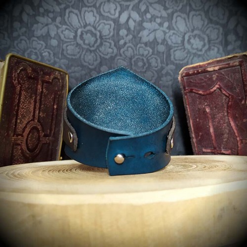 Bracelet corset en cuir bleu pétrole de conception artisanale, création originale de l'Atelier de Maître Hobbit, entièrement fait main. Motif élégant cuir noir évidé, collé et fixé à l'aide de rivets argentés. Cuir pleine fleur, tannage végétal, teinture pigments naturels, cire artisanale. Belle finition, qualité artisanale, durée de vie assurée.