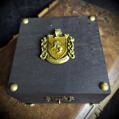 Coffret / boîte à bijoux en bois avec beau logo Poufsouffle en métal sur le couvercle, de la saga Harry Potter. Intérieur velours. Création originale de l'atelier Horror Tools, entièrement faite main. Fermoir, clous et pieds en laiton couleur argent.