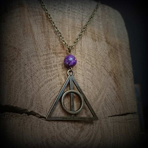Collier pendentif reliques de la mort, symbole tiré de la saga Harry Potter, couleur bronze. Pendentif agrémenté d'une perle en jaspe violet.