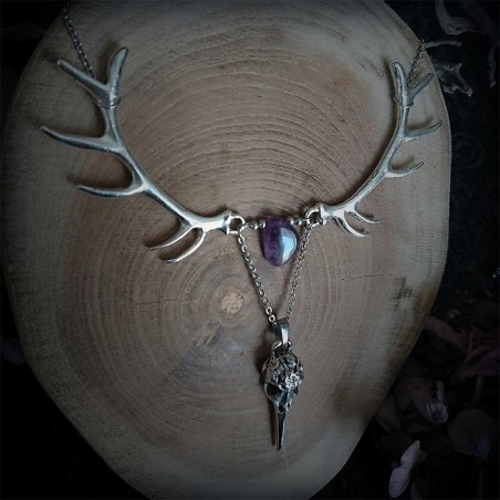 Collier bois de cerf, crâne d'oiseau et améthyste
