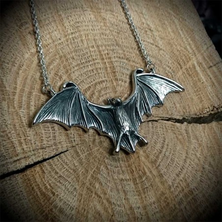 Collier grande chauve-souris aux ailes déployées (68 mm d'envergure), en acier couleur argent vieilli (patine noire donnant du relief).