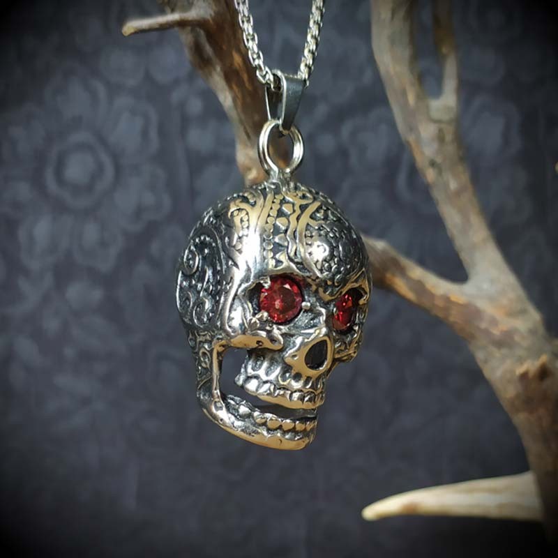 Collier pendentif gothique / rock tête de mort en acier, décors filigrané, yeux en strass rouge, motif inspiration Santa Muerte.
