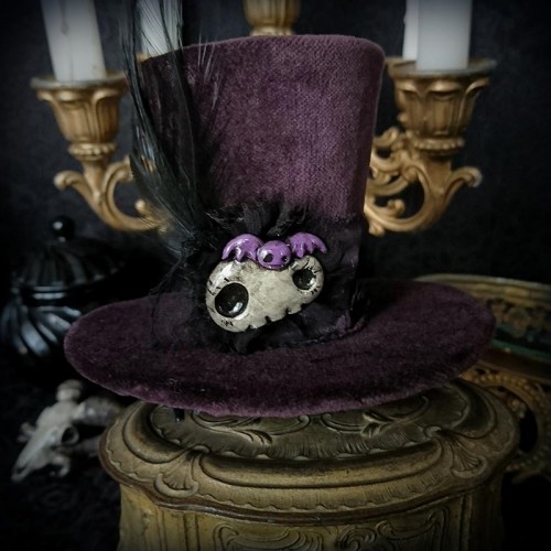 Mini-Hat "Little Monster" tissu violet et noir, plumes. Création originale de Pretty Dolls Factory. Pièce unique.